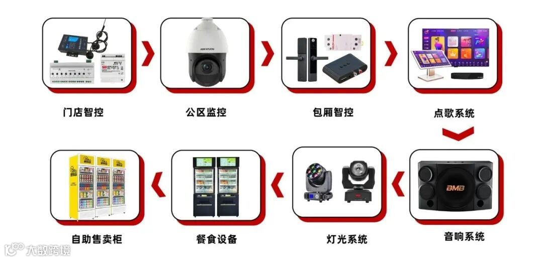 硬件资源整合供应:智能门锁、监控设备、包厢智控系统、专业点歌机、音响、氛围灯光、沙发茶几、自助售卖柜等,均提供优质供应商资源,且所有硬件可与系统无缝打通,避免兼容问题,并都会进行测试;