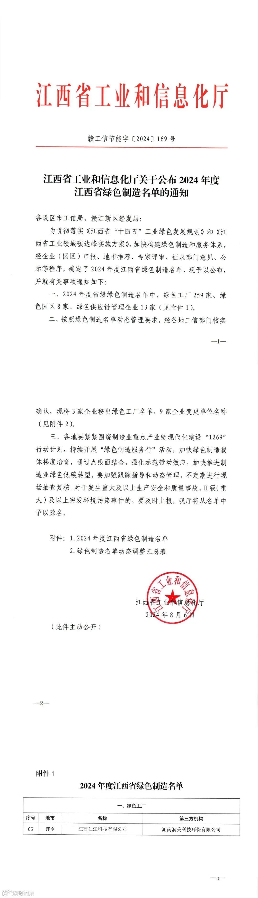 近日,江西省工业和信息化厅公布2024年度江西省绿色制造名单,江西仁江科技有限公司凭借卓越的绿色发展理念与实践成果,获评“江西省绿色工厂”称号!这一殊荣,不仅是对我们长期以来坚持绿色发展理念的高度认可,更是我们在可持续发展道路上迈出的坚实一步。我们将以此为新的起点,继续加大在绿色制造方面的投入,不断提升企业的绿色发展水平。