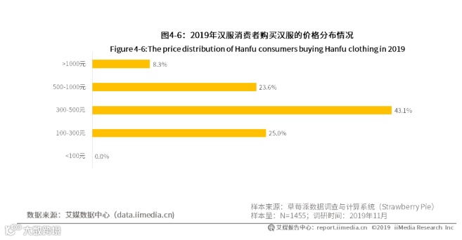 对于单套汉服的价格,约一半的汉服消费者表示300元至500元之间为通常购买的价格带,同时也有31.9%的消费者表示可接受500元直至1000元以上的汉服。