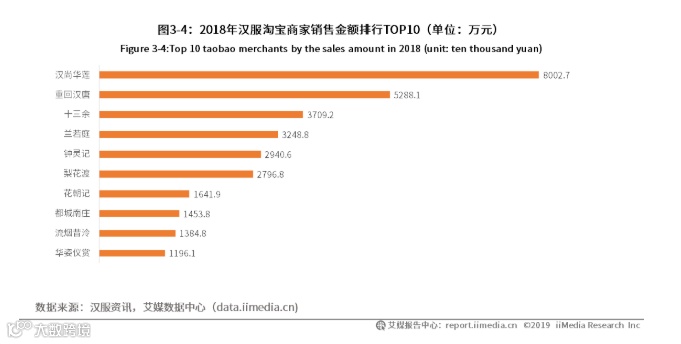 汉服的火爆带动了相关产业的发展,曾经小众的文化产品,开始成为一门热门的生意。目前,淘宝汉服商家的销售额占中国汉服市场总规模的75%,淘宝是汉服产业的最主要销售渠道。2018年在淘宝及天猫上,销售业绩最好的是汉尚华莲,全年销售金额达8000万元以上;汉服销售业绩排位前十的商家年产值均达到千万以上的规模。