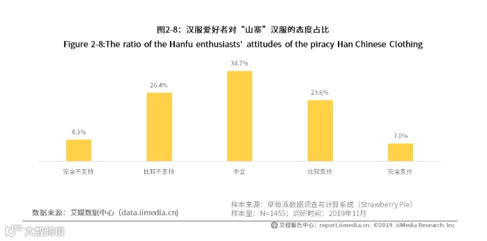 从汉服消费者对“山寨”汉服的态度来看,消费者对“山寨”汉服的看法趋于中立,持中立观点的占比为34.7%。目前还没有“正统的”汉服标准,因此,汉服爱好者对于所谓的“原创” 和“山寨”态度差异不大。并且,“山寨”汉服大多价格便宜,汉服消费者并不是很抵触。