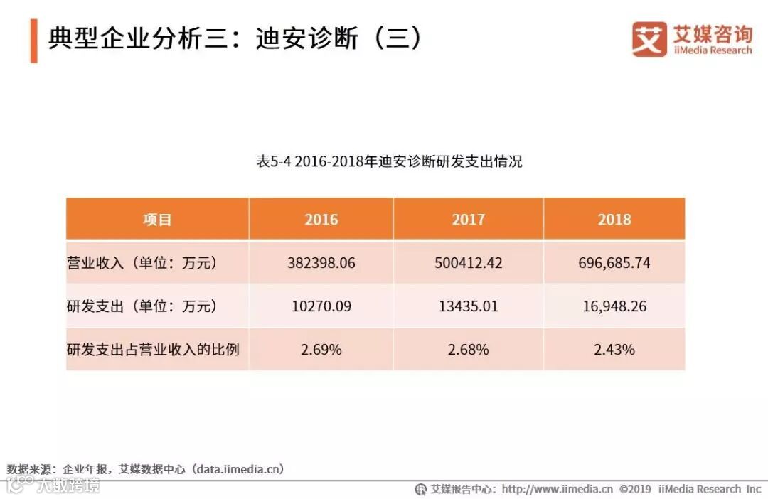 迪安诊断的研发费用比例趋势在降低,并且迪安诊断的研发资金投入在2018年也仅仅为1.6亿元,与国内龙头企业迈瑞生物有一个数量级的差距,与国外医疗公司差距更大。但迪安诊断的上游产品转化方面取得重大进展,共取得三类注册证2项,二类注册证1项,备案产品增加到23项,目前有2个三类诊断试剂产品进入注册程序,病理和分子诊断产品进一步丰富。