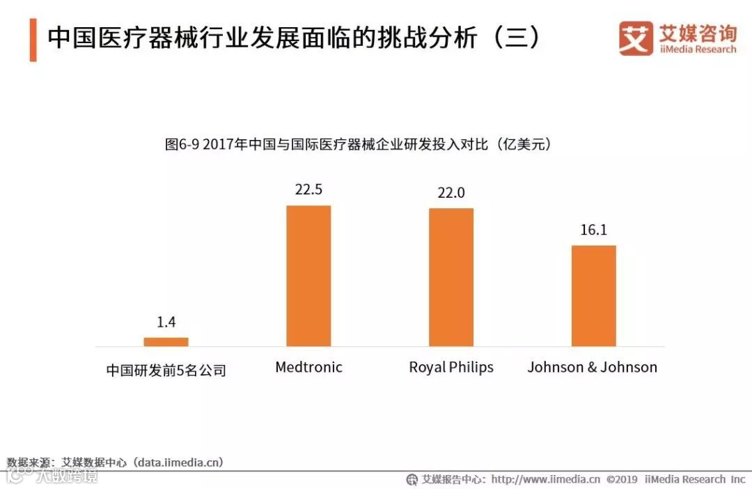企业规模小、研发投入不足,导致科技成果转化能力薄弱,没有技术和实力去超越跨国企业及国内主流企业,只能走仿制的道路,或生产中低端、具有价格优势的常规产品,包括中小型器械及耗材类产品,仅有部分产品足以和进口医疗器械抗衡,如监护仪、麻醉机、血液细胞分析仪、彩超和生化分析仪等,总体水平与国外仍存在较大差距。