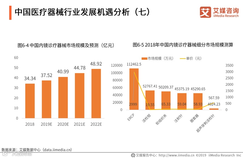 内镜诊疗作为微创治疗的核心部分,随着微创治疗的全球化推开,迎来行业的快速发展期。艾媒咨询分析师认为,中国消化系统疾病高发,随着人们对于内镜检查的越发重视,加之中国人口老龄化的加剧,居民消费能力及医保普及率的提高,中国内镜诊疗市场有着广阔的发展空间,预计至2022年市场规模将会至少达到48.92亿元。