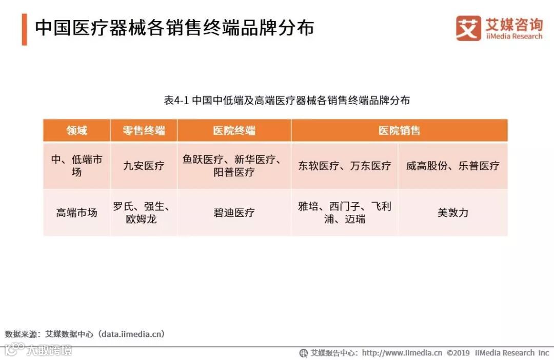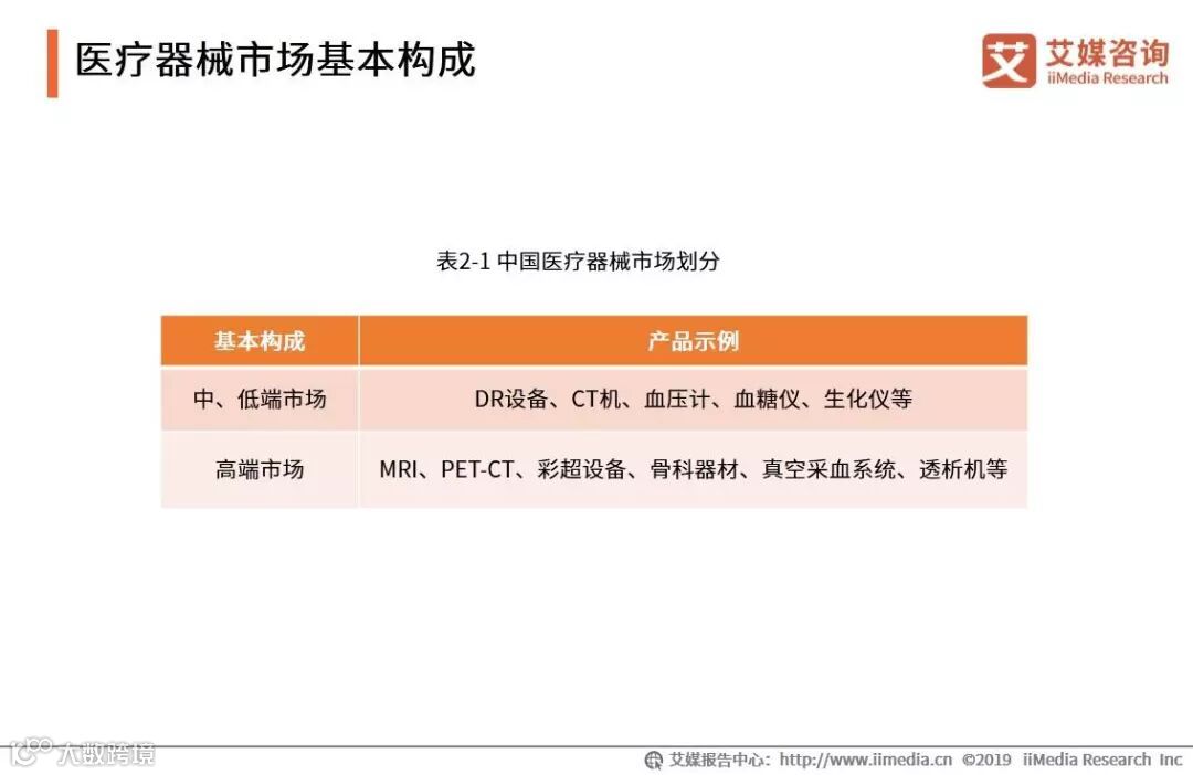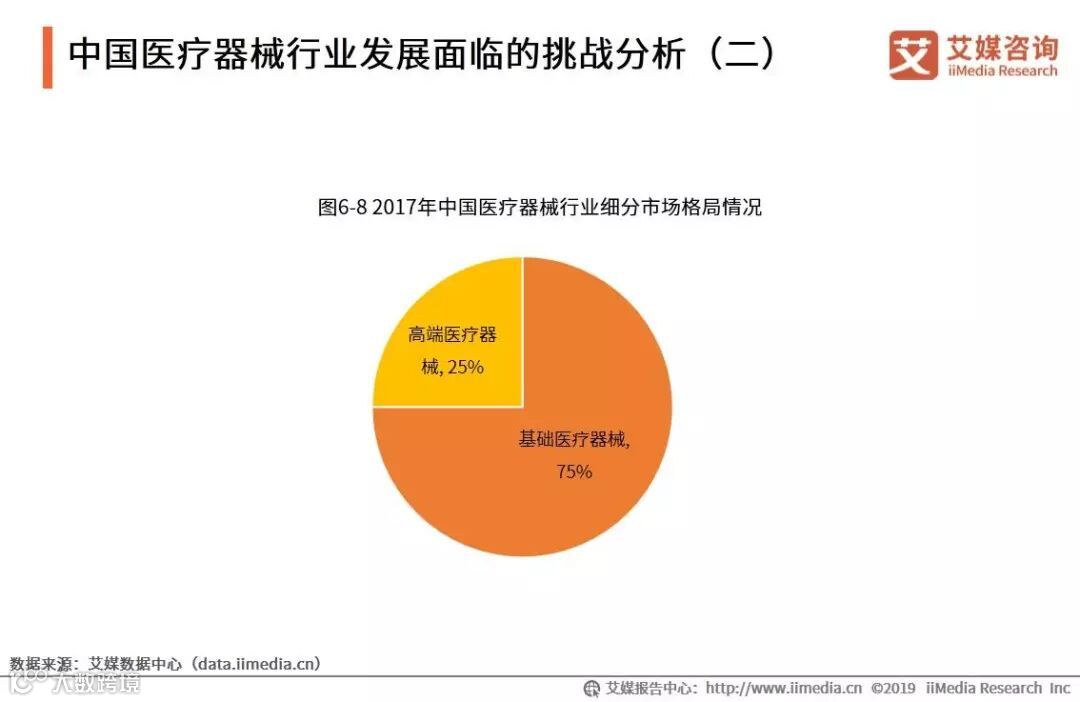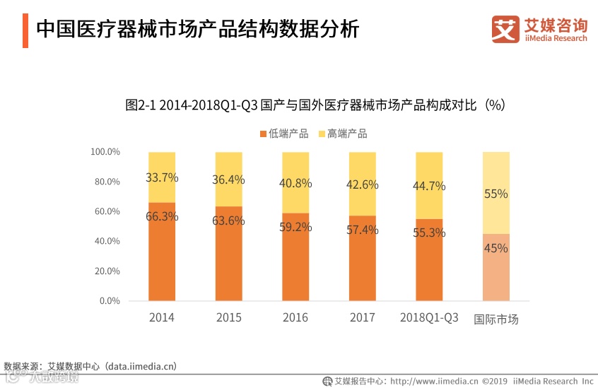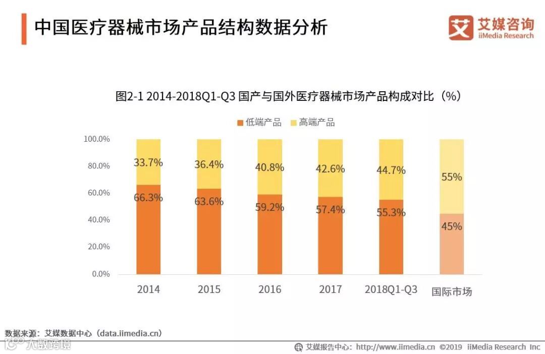 早期中国医疗器械市场中,中低端产品占据了将近70%的比例,而高端产品仅占30%左右的比例,而国际医疗器械市场的结构为高端产品占55%,低端产品占45%。艾媒咨询分析师认为,相比于全球医疗器械市场,近三年中国医疗器械市场的结构已趋向优化但结构依然严重不平衡,高端医疗市场将成为下一个发力点。