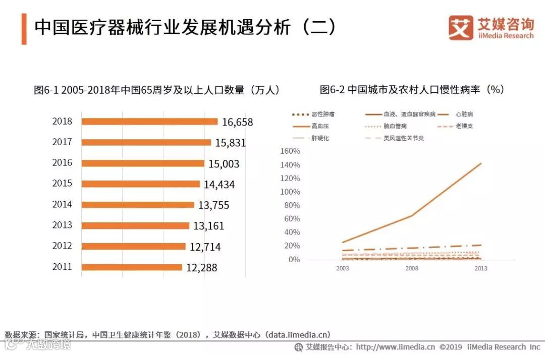 截至2018年,中国老年人口数量超过1.6亿人,老龄人口的增加将不断扩大对医疗器械的需求;同时,由于人口的老龄化,总人群的慢性病患病率增加了一倍,病人数量将呈现稳步增加的态势。
