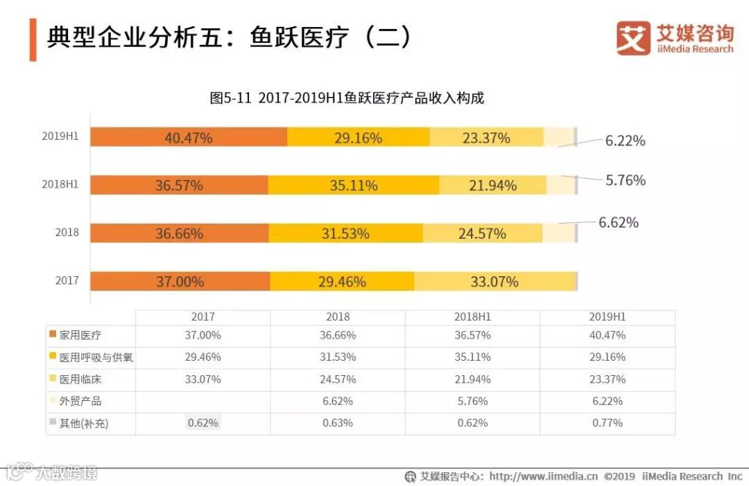 2019上半年家用医疗、医用呼吸与供氧、医用临床和外贸产品分别占总收入的40.5%、29.2%、23.4%和6.2%。其中,家用医疗板块方面,线上平台业绩增长突出,同比增速在40%以上,线下平台在人员、机构调整、终端精细化策略的影响下,也达到10%以上的增长。
