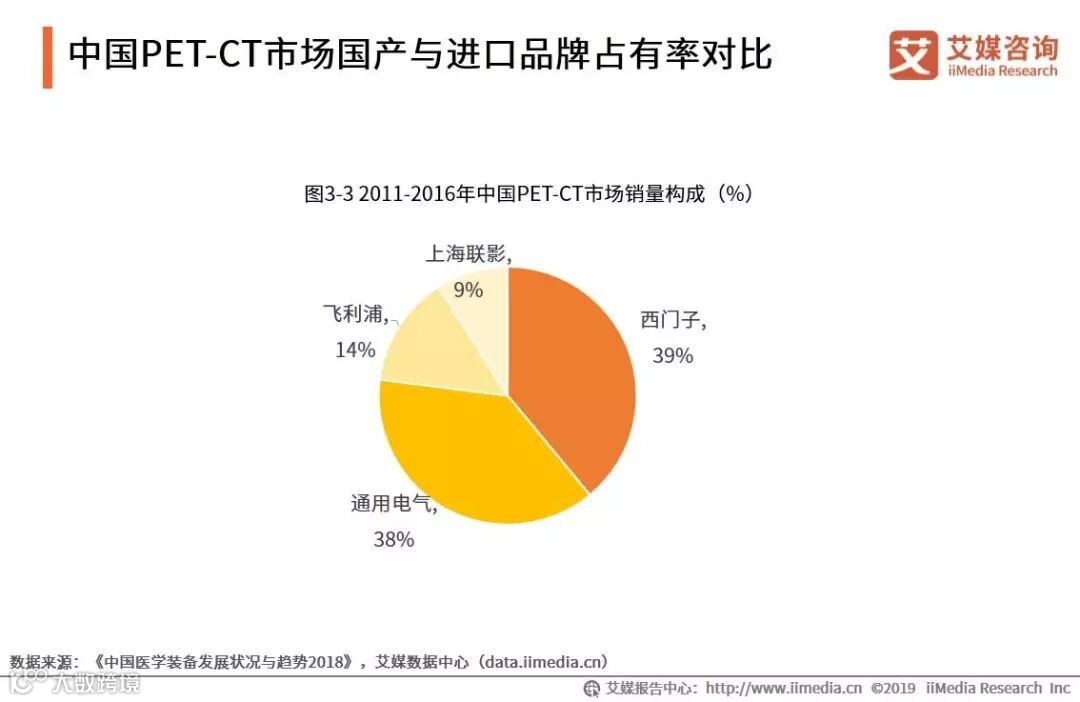 在国家支持下,以联影、大基康明、东软等为代表的国内厂商开始在PET-CT 产品方面有所突破。近两年来,PET-CT市场国产化率明显提升,上海联影已跻身市场前列,但西门子、通用电气和飞利浦仍占据头部市场。艾媒咨询分析师认为,国产PET-CT在影像清晰度、性能稳定性、操控性等方面对比进口产品还有较大差距,需要进一步改进。