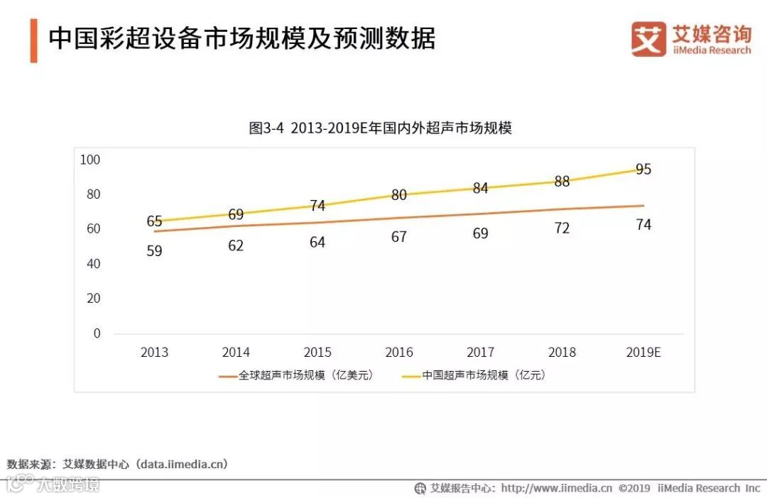 2013 年到2017 年,全球医用超声诊断设备市场规模由59 亿美元增加到69 亿美元,预计2019 年市场规模达到74 亿美元,期间复合增长率为3.9%。2013 年到2017 年,国内超声诊断设备市场规模由65 亿元增加到84亿元,预计2019 年市场规模达到95 亿元,期间复合增长率为6.5%。
