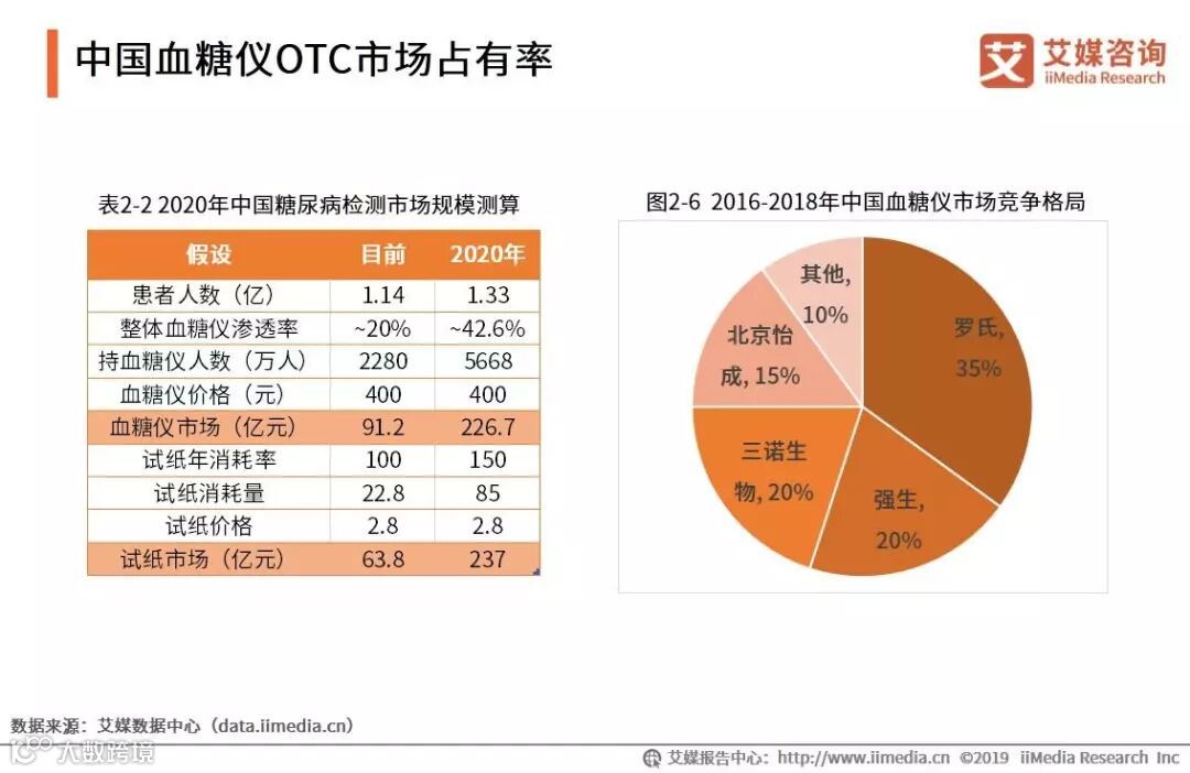 全球血糖监测系统市场容量达200多亿美元,中国血糖监测系统市场规模约60亿元。从品牌看,国外品牌在中国血糖仪市场上仍然占据主导地位,其中罗氏比例最高约占35%;而中国品牌三诺生物约占20%,北京怡成约占15%。艾媒咨询分析师认为,随着国内外血糖仪生产开发技术差距的缩小,国产血糖仪已经能够满足大部分患者的需求,且价格优势明显,具有较高性价比,替代效应逐渐显现。