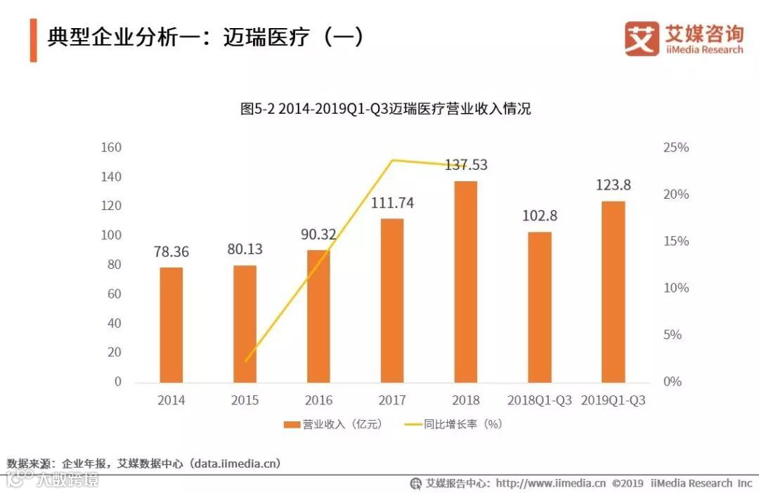 2018年10月,迈瑞医疗在深圳创业板上市,2018年公司市值达到1327亿,为A股创业板市值最高企业,同时也是目前A股医疗器械行业收入与利润规模最大企业,2018年营业收入达到137.53亿元,2014年-2018年营业收入年复合增长率为15.1%,归母净利润复合增长率为68.69%。