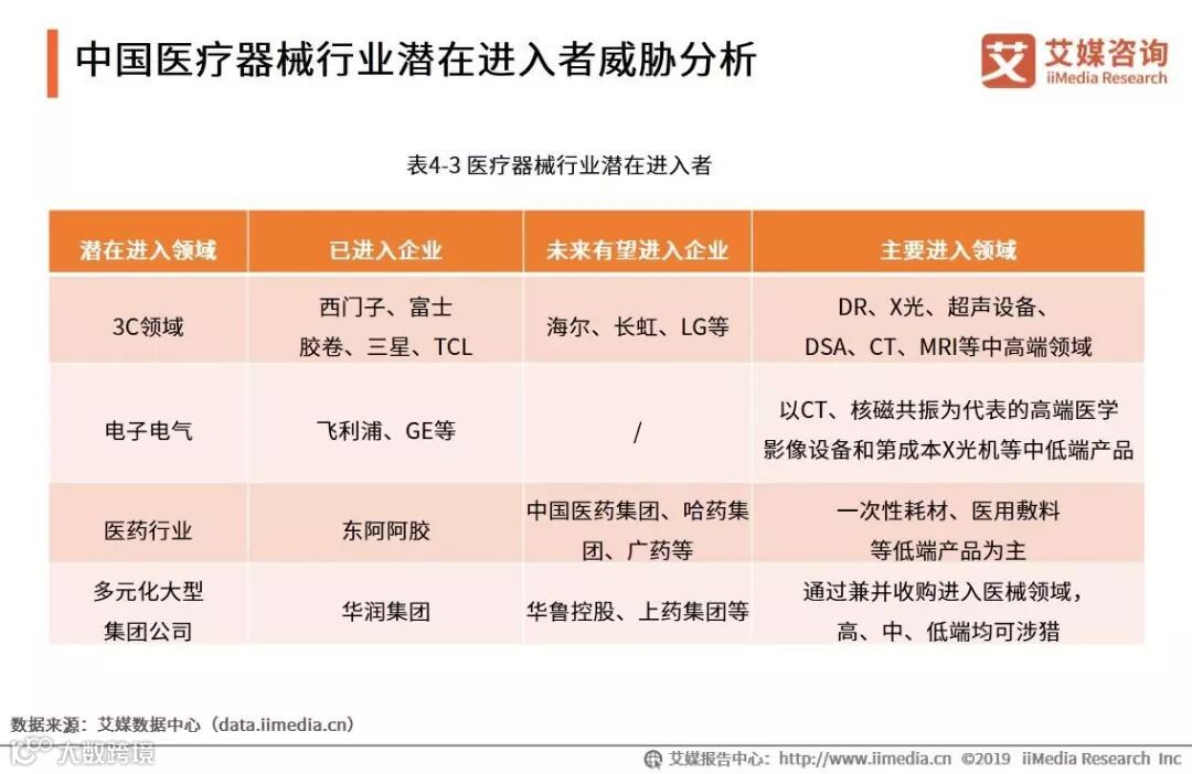 受人工智能、物联网、5G等技术的影响,高端化、智能化和家庭化是中国医疗器械产业发展最为显著的三大趋势。特别是医疗大数据、高端医疗影像设备、家用医疗器械、智能便携式医疗设备等领域将会备受关注。