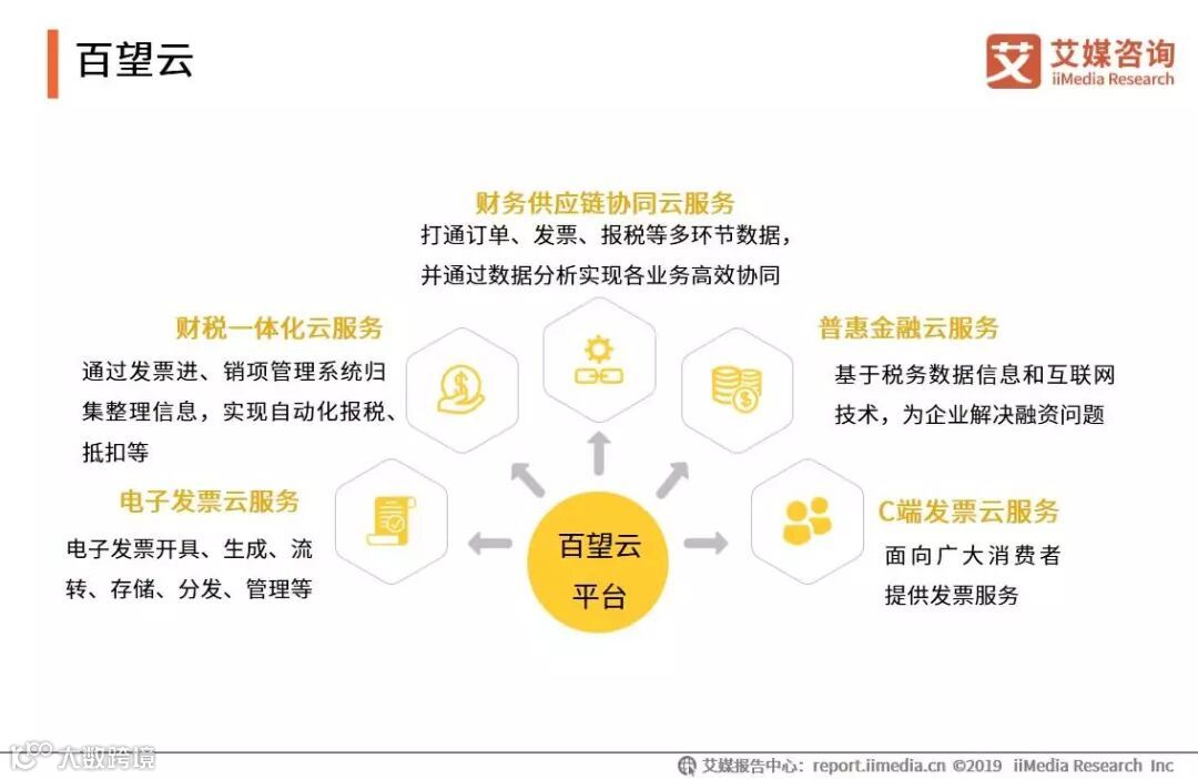 百望云是百望股份于2016年正式推出的财税数字商业平台。百望云以电子发票为作为财税数据入口,全面打通企业与供应链、消费者、税务系统之间的联系,逐渐形成了覆盖电子发票、C端发票、财务供应链协同、普惠金融、财税一体化五大板块的综合云服务平台。艾媒咨询分析师认为,百望云试图建立的电子发票数据闭环还有赖于政策层面进一步完善电子发票应用规范以及市场教育的持续深化,完全落地仍需时间。