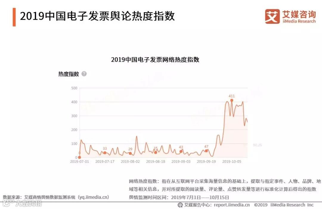 艾媒商情舆情数据监控系统显示,2019年下半年以来电子发票一直保持相对稳定的舆论热度,至9月底舆论热度明显上升。艾媒咨询分析师认为,此次舆论热度的上升是由高灯科技完成新一轮的融资所引发。