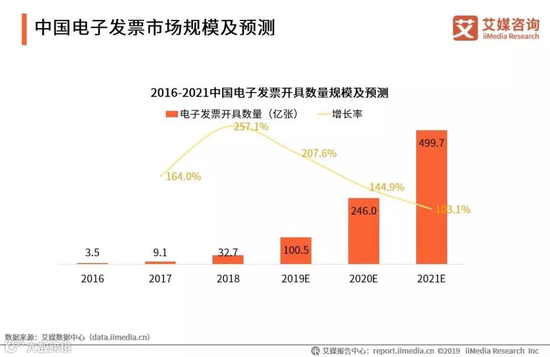 iiMedia Research(艾媒咨询)数据显示,2018年全国电子发票开具数量为32.7亿张,较2017年增长了257.1%。艾媒咨询分析师认为,随着国家政策持续的引导和推进,以及市场教育程度的深化,电子发票普及率将会快速提升,电子发票开具数量也将维持高速增长态势,预计2021年将接近500亿张。