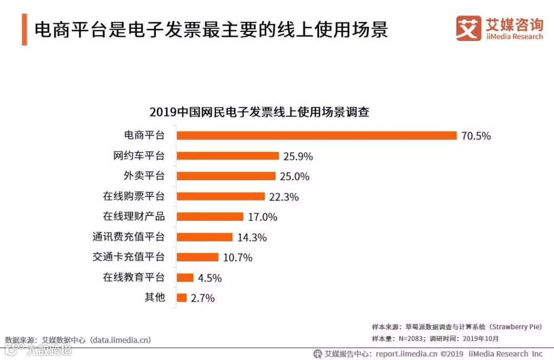 iiMedia Research(艾媒咨询)数据显示,在使用过电子发票的受访网民中,70.5%的网民表示其在电商平台使用过电子发票,25.9%的网民表示在网约车平台使用过电子发票。艾媒咨询分析师认为,电子发票由网络发票发展而来,其最初的用途就是解决电商征税问题,在政策推动下率先在电商平台普及。以京东、苏宁、国美为代表自营电商在消费者交易完成后会默认开具电子发票,间接提高了网民在电商平台的使用率。