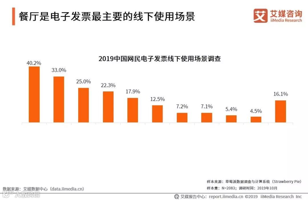 iiMedia Research(艾媒咨询)数据显示,在使用过电子发票的受访网民中,餐厅和酒店是其最常使用电子发票的场景,占比分别为40.2%、33.0%。艾媒咨询分析师认为,餐厅、酒店是发票索要率较高的场景,但传统纸质发票的开具方式耗时耗力。节约成本以及改善消费者体验,成为这些领域使用电子发票的主要驱动力。