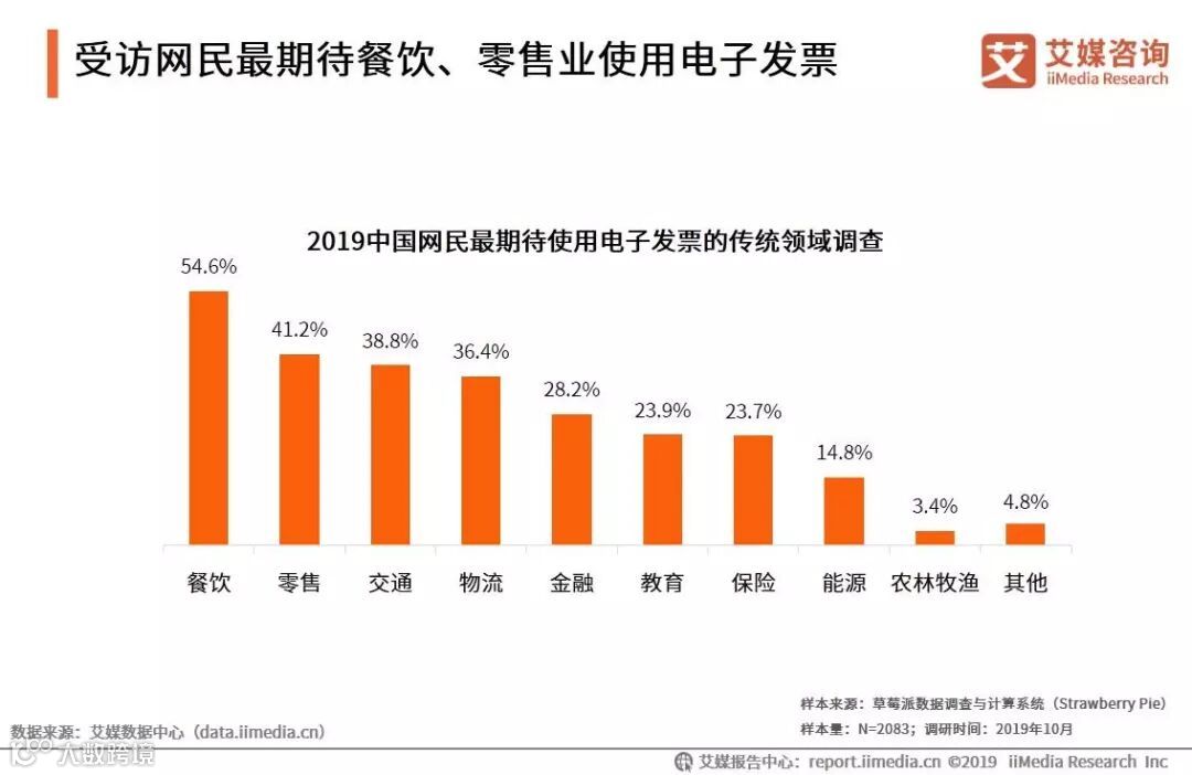iiMedia Research(艾媒咨询)数据显示,在对电子发票有所了解的受访者中,54.6%的网民期待餐饮业能够推行电子发票的使用,41.2%的网民希望零售业能够推进电子发票,选择交通业的占比为38.8%。艾媒咨询分析师认为,餐饮、零售、交通业均属于消费人群广、消费频率高的行业,开具纸质发票需要耗费企业大量的人力成本和时间成本,无形中也会影响用户的开票体验。在这些领域推行电子发票,其产生的改善效果也会更加显著。