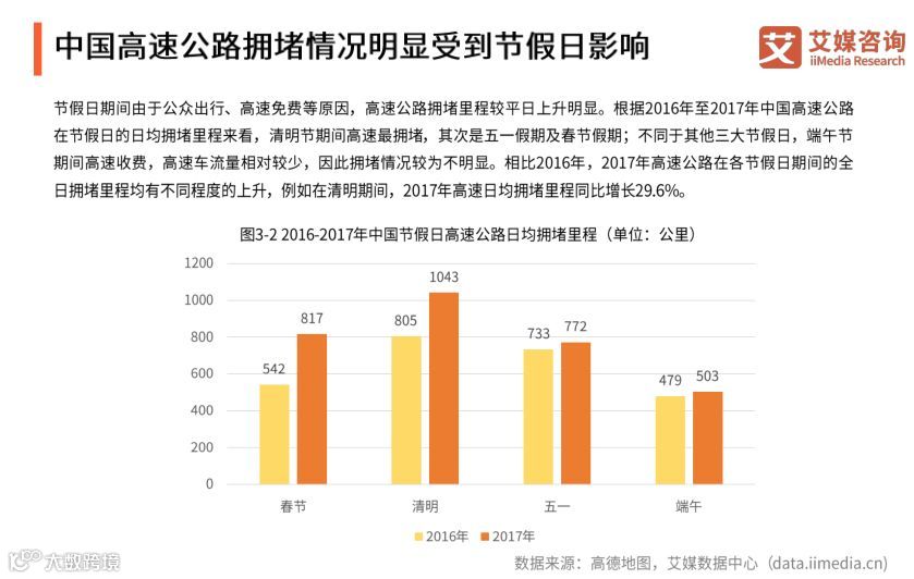说到这,不知道听众朋友们会不会产生疑惑:ETC早就有了,为什么今年尤为大力推广呢?因为我国高速公路拥堵情况急需缓解。我国高速公路的拥堵明显受到节假日影响,节假日期间由于公众出行、高速免费等原因,高速公路拥堵里程较平日上升明显。根据2016年至2017年中国高速公路在节假日的日均拥堵里程来看,清明节期间高速最拥堵,其次是五一及春节假期。