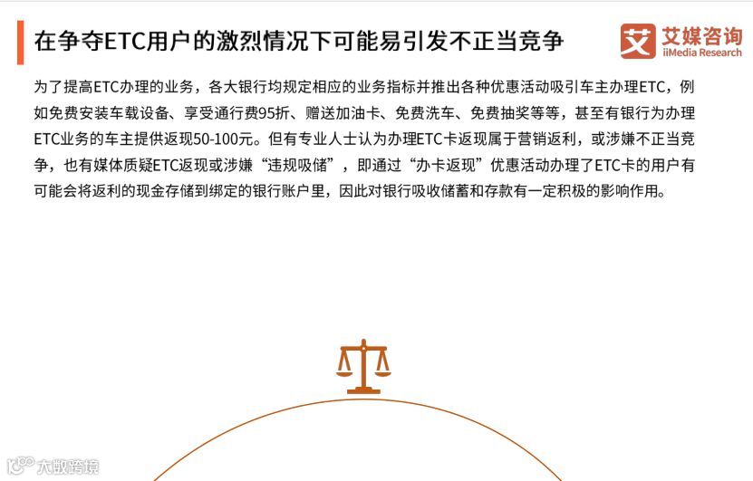 另一方面是在争夺ETC用户的激烈情况下可能易引发不正当竞争。为了提高ETC办理的业务,各大银行均规定相应的业务指标并推出各种优惠活动吸引车主办理ETC,但有专业人士认为办理ETC卡返现属于营销返利,或涉嫌不正当竞争,也有媒体质疑ETC返现或涉嫌“违规吸储”,即通过“办卡返现”优惠活动办理了ETC卡的用户有可能会将返利的现金存储到绑定的银行账户里,因此对银行吸收储蓄和存款有一定积极的影响作用。
