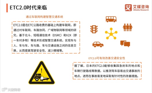 这些问题确实需要国家、银行、企业等方面发力去解决。但是这些总体对ETC这个行业不会造太大的影响,ETC将朝着更加智能化的方向发展。未来,ETC2.0时代将来临。ETC2.0是在ETC公路收费的基础上构建车联网,即通过对车联网、车路协同、广域物联网等领域的研究,基于北斗、短程通信技术(DSRC) 和V2X (即一车对多物)等技术形成智慧交通系统,实现车与人、车与车、车与路、车与交通设施之间的信息交换,从而提高驾驶安全性、减少拥堵等。