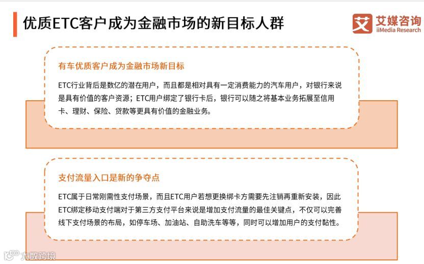 ETC行业背后是数亿的潜在用户,而且都是相对具有一定消费能力的汽车用户,对银行来说是具有价值的客户资源;ETC用户绑定了银行卡后,银行可以随之将基本业务拓展至信用卡、理财、保险、贷款等更具有价值的金融业务。并且,ETC装备一旦安装后客户一般不轻易更换,因此这类客户往往粘性更高,有利于金融机构对客户保持长期关注,实现精准服务。