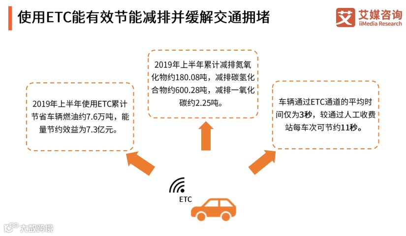 使用ETC能有效节能减排并缓解交通拥堵。艾媒咨询发布的《2019全球ETC行业现状与中国产业链商业布局研究报告》大数据显示,2019年上半年使用ETC累计节省车辆燃油约7.6万吨,能量节约效益为7.3亿元;累计减排氮氧化物约180.08吨,减排碳氢化合物约600.28吨,减排一氧化碳约2.25吨。并且,车辆通过ETC通道的平均时间仅为3秒,较通过人工收费站每车次可节约11秒。
