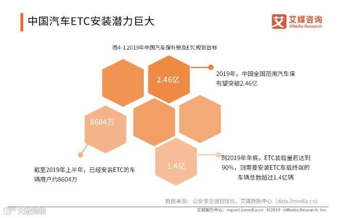 在国家政策及社会需求的大力推动下,ETC业务全面展开,汽车ETC安装潜力巨大。艾媒咨询大数据显示,2019年中国汽车保有量有望突破2.46亿,到2019年年底,ETC装载量将达到90%。预计2019-2020年,中国ETC市场将会全面爆发,ETC带动的产业规模预计将超过200亿元,届时将带动相关企业及上下游产业链规模将突破2000亿元。