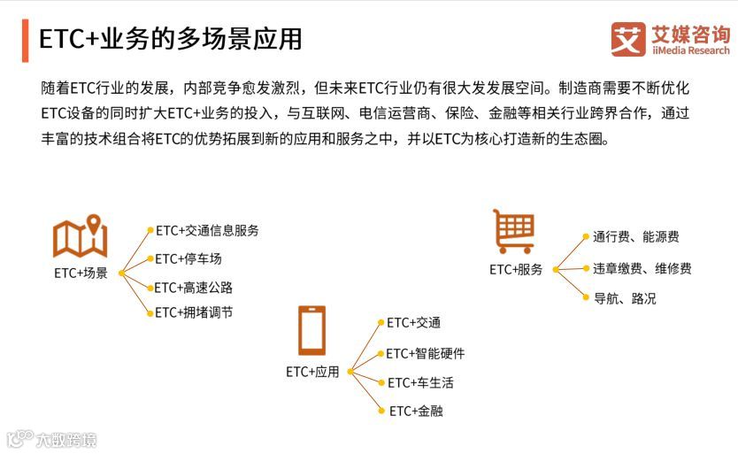 另外,ETC+业务将应用到多场景。随着ETC行业的发展,内部竞争愈发激烈,但未来ETC行业仍有很大发发展空间。制造商需要不断优化ETC设备的同时扩大ETC+业务的投入,与互联网、电信运营商、保险、金融等相关行业跨界合作,通过丰富的技术组合将ETC的优势拓展到新的应用和服务之中,并以ETC为核心打造新的生态圈。