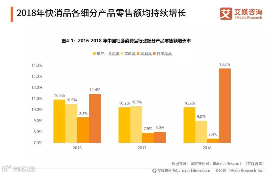 2018年,快消品行业各细分产品的零售额均持续增长,其中粮油、食品类同比增长10.2%,饮料类同比增长9.0%,烟酒类同比增长7.4%,日用品类同比增长13.7%。