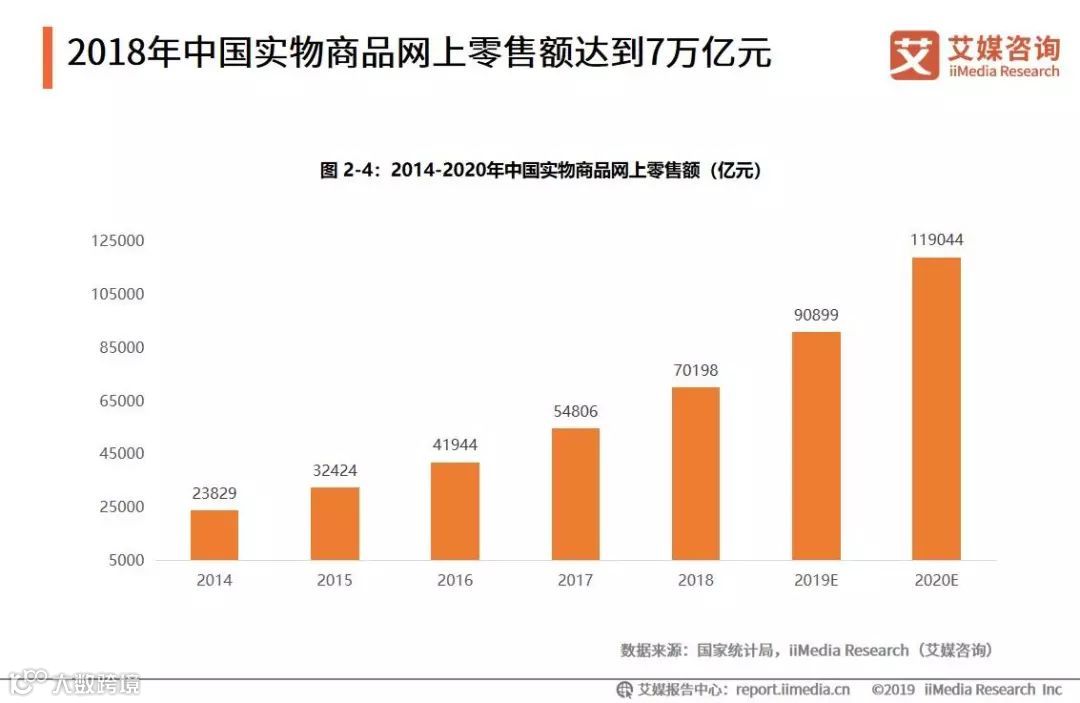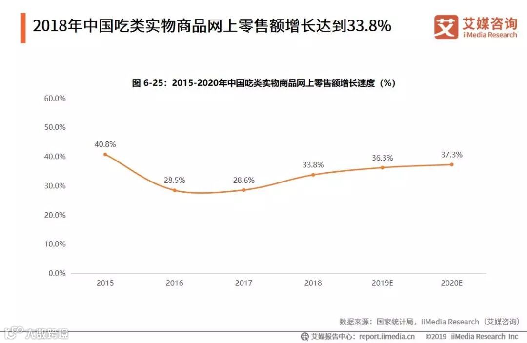 2018年中国吃类实物商品网上零售额增长达到33.8%