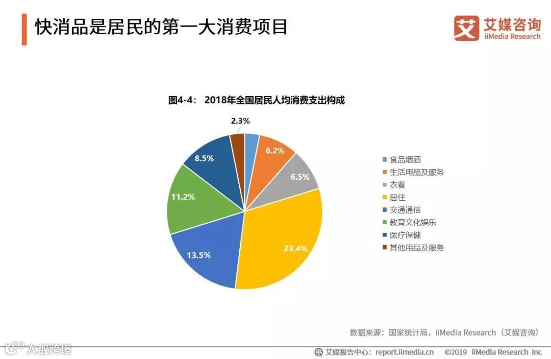 2018年,全国居民人均消费支出结构中,食品烟酒为最大支出项目,占据人均消费支出的28.4%;将食品烟酒和生活用品计入快消品品类,2018年快消品消费在居民消费的比重约为34.6%,是居民消费金额最大的项目。