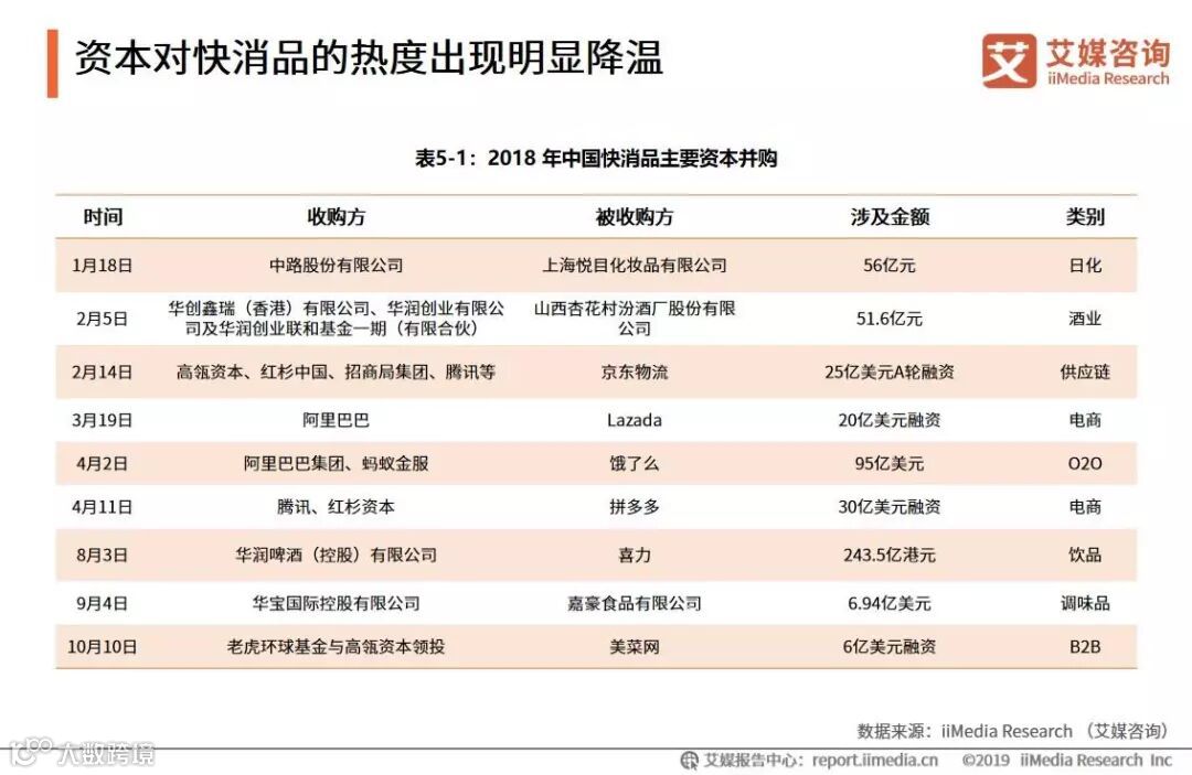 根据最新发布数据,2018年中国共发生238起快消品主要资本事件,与2017年相比增加10.2%;但涉及金额为2476.1亿元,同比减少52.1%,显示出资本对快消品的热度出现降温。快消品并购呈现加码全渠道布局和联合跨界等并购特点。
