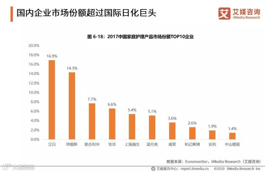与个人护理品相比,中国家庭护理市场企业集中度相对较高,TOP10企业占比超过60%的市场份额,其中立白、纳爱斯集团以较大的优势占据第一、二位。在家庭护理行业中排名前10的企业有6家是本土企业。