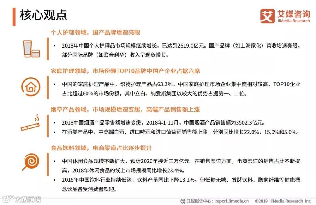 2018年中国个人护理品市场规模继续增长,已达到2619.0亿元。国产品牌(如上海家化)营收增速亮眼,部分国际品牌(如联合利华)收入呈现负增长。中国的家庭护理产品中,织物护理产品占63.3%。市场集中度相对较高,TOP10企业拥有超过六成的市场份额,其中立白、纳爱斯集团以较大的优势占据第一、二位。2018中国烟酒产品零售额增速变缓,2018年1-11月,中国烟酒产品销售额为3502.3亿元。在酒类产品中,中高端白酒、进口啤酒和进口葡萄酒销售额上涨,分别同比增长22.0%,15.0%和5.0%。中国休闲食品规模不断扩大,预计2020年接近三万亿元。在销售渠道方面,电商渠道的销售占比不断提高,2018年休闲食品的线上市场规模同比增长23.4%。2018年中国饮料行业持续低迷,饮料产量同比下降13.1%。但低糖无糖、发酵饮料、膳食纤维等健康概念饮品备受消费者欢迎。随着居民消费水平的提高,中国消费者对高端快消品购买意愿的增加,未来中国快消品行业规模将继续稳步上升。(《《2019年中国快消品行业研究与发展报告》完整高清PDF版共104页,点击底部“阅读原文”进行报告下载)。