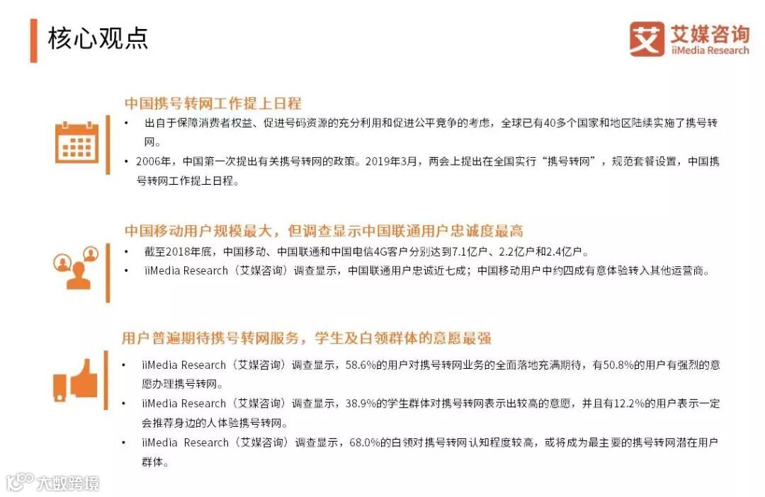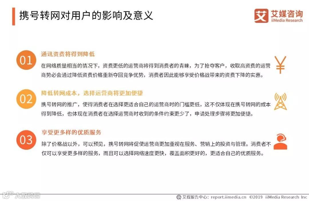 中国携号转网部署工作逐步推进,将会给三大运营商带来巨大的挑战。目前,用户对中国电信和中国移动的资费问题最为不满,对中国联通的网络信号及通话质量最不满意。iiMedia Research(艾媒咨询)调查显示,有50.8%的用户有强烈的意愿办理携号转网,其中学生和白领两类人群对携号转网认知程度和体验意愿较高,或将成为最主要的携号转网潜在用户群体。艾媒咨询分析师认为,携号转网政策的落地实施将对三大运营商造成局部洗牌,运营商应在自身优势的基础上优化用户服务。(《2019中国携号转网新规用户心态与行动预判调研报告》完整高清PDF版共84页,点击底部“阅读原文”进行报告下载)。