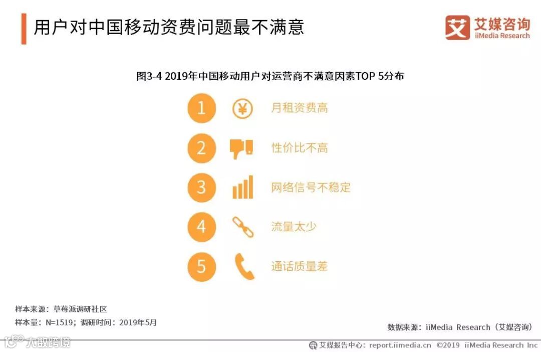 iiMedia Research(艾媒咨询)调查显示,中国移动用户对运营商的不满意因素前五分别为月租资费高、性价比不高、网络信号不稳定、流量太少和通话质量差。中国移动以“5元30M”的低性价比形象,备受用户诟病,这表明中国移动在资费问题和性价比方面仍有很大改进空间。