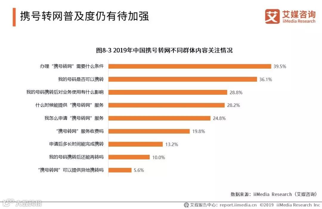 iiMedia Research(艾媒咨询)数据显示,39.5%的用户关注“办理‘携号转网’需要什么条件”,36.1%的用户关注“我的号码是否可以携转”。这两个问题都属于携号转网的基本问题,即申请准入门槛,用户对这些问题的疑惑源于携号转网目前的普及度不高,流程手续方面并未进行大范围推广。