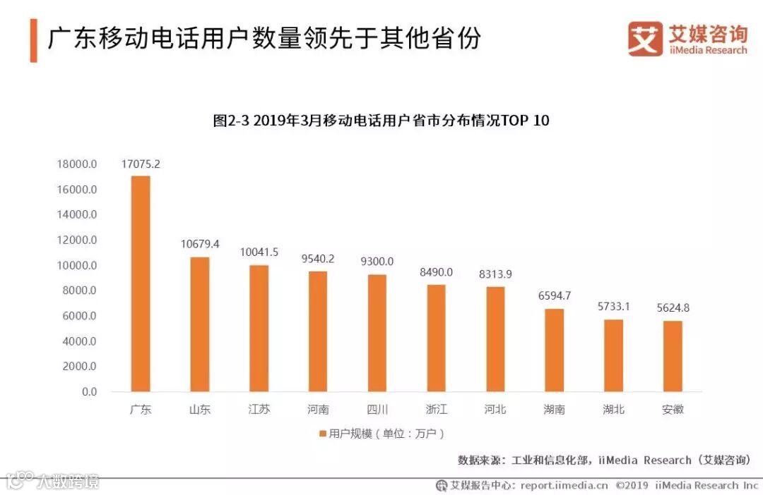 广东移动电话用户数量领先于其他省份