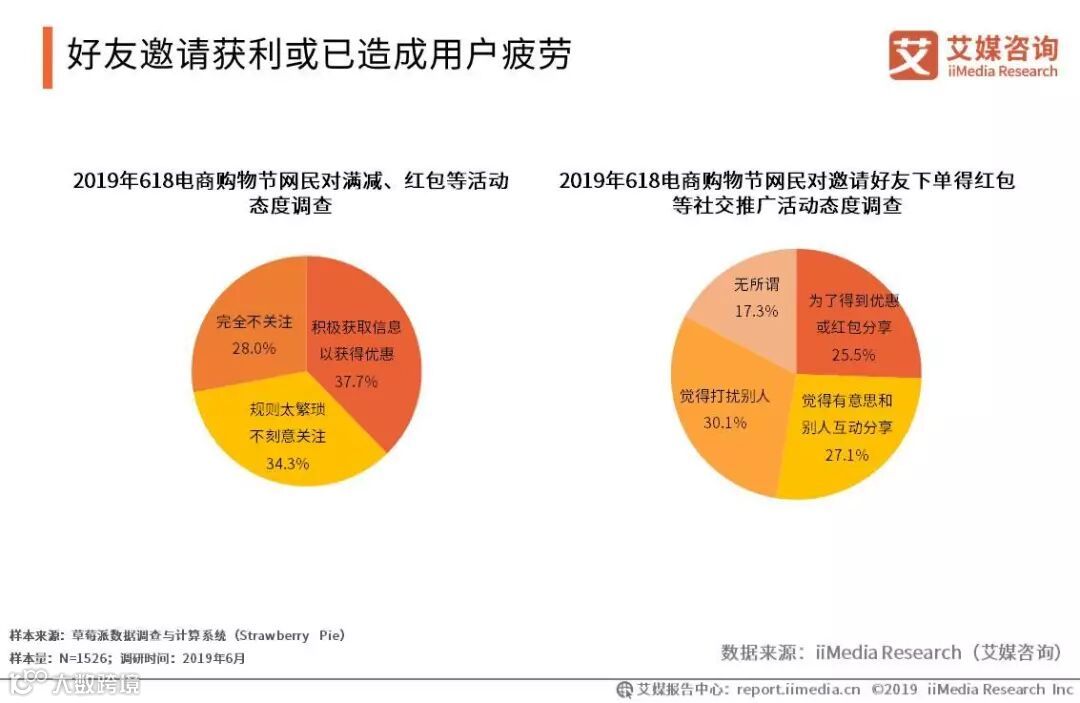 iiMedia Research(艾媒咨询)数据显示,受访网民对活动的关注与态度分化。超三分之一(37.7%)的受访网民会积极获取各种活动信息以获取更多的优惠和折扣,同时也有34.3%的受访网民认为618各种活动的规则太麻烦和繁琐,平时并未刻意关注,只在下单前领取优惠。另外,针对邀请好友得红包等类似社交推广活动的网民态度调查发现,仅25.5%的受访网民为得到优惠或红包参与邀请好友,单一通过邀请好友获利的方法或已造成用户疲劳。