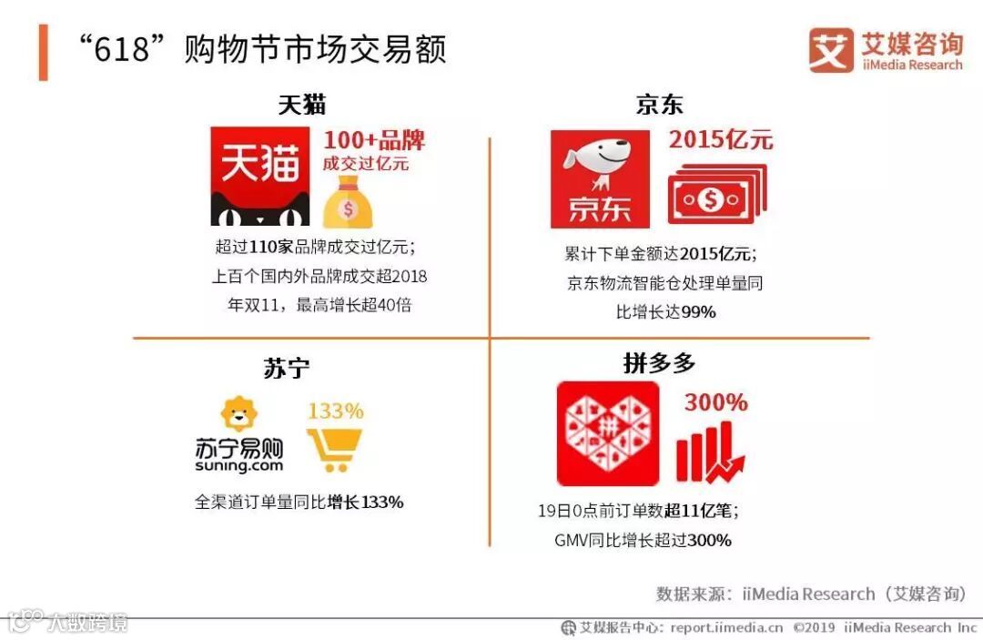 各大电商“618”战报再创新高。天猫超过110家品牌成交过亿元;京东累计下单金额达2015亿元;苏宁全渠道订单同比增长133%;拼多多订单数超11亿笔。