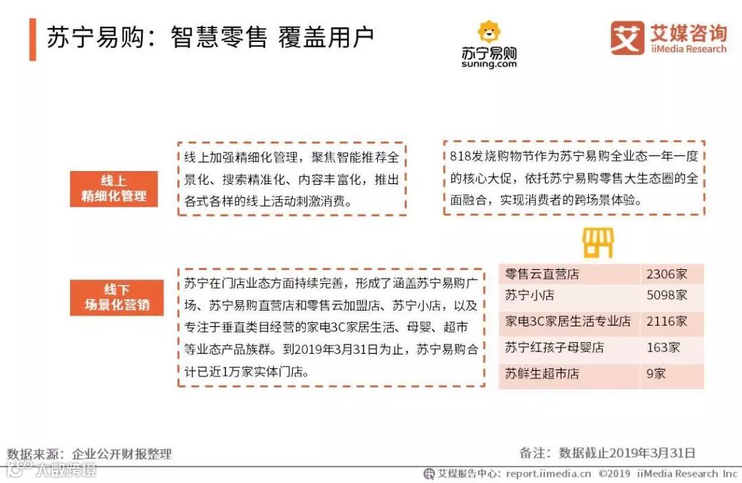 艾媒咨询分析师认为,苏宁不断推进全场景零售的发展。线上,除了加强精细化管理,还将多业务与消费场景融合,通过各种线上活动提升流量转化率。线下,则通过不同类型专门店的铺设,为用户带来专业化的场景消费体验。