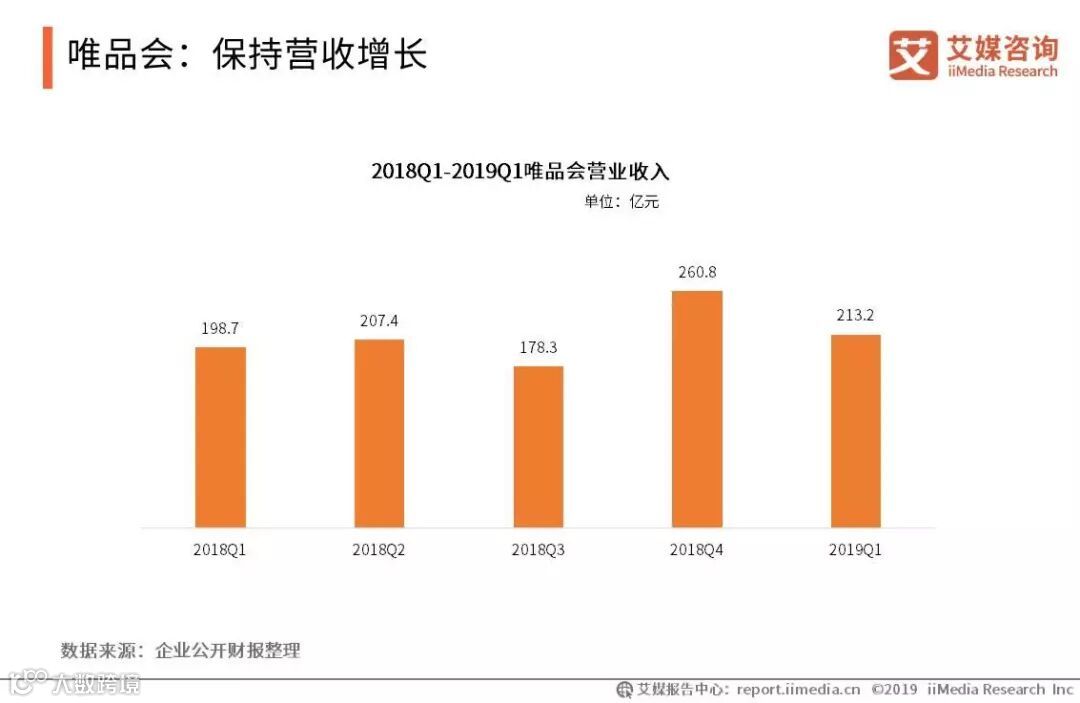 iiMedia Research(艾媒咨询)数据显示,2019年第一季度营业收入为213.2亿元,同比增长7.3%。其中,服装穿戴GMV占比持续上升,占比超一半,同比增加16%。艾媒咨询分析师认为,唯品会以服装穿戴品类为亮点,关注喜爱服装穿戴品类的用户,为其提供专业的服务,契合用户的需求,以此成为推动唯品会营收增长的保障。