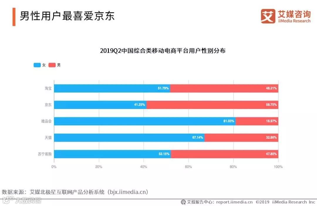 iiMedia Research(艾媒咨询)数据显示,淘宝、唯品会、天猫、苏宁易购更受女性用户喜爱,而男性用户则倾向于京东。其中唯品会的女性用户最多,占比81.03%,使用京东的男性用户占比最多,为58.75%。
