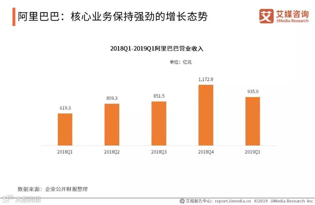 2019年第一季度阿里巴巴营业收入为935.0亿元。阿里巴巴的核心业务主要包括国内零售批发业务,跨境和国际零售批发业务,菜鸟物流服务和本地生活服务。2019财年,核心电商业务全年收入同比增长51%,其中中国国内零售保持40%的高增长速度,跨境和国际零售业增长了38%,菜鸟物流服务增长120%。