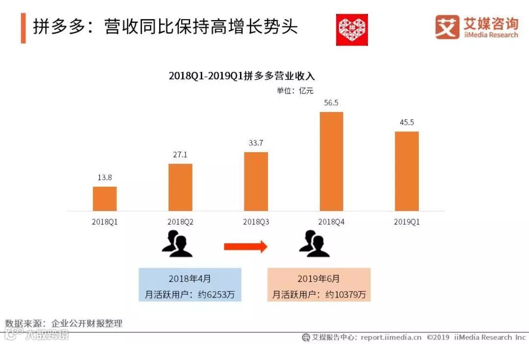 2019第一季度,拼多多的同比营收额保持增长的速度。艾媒咨询分析师认为,拼多多,以拼购为亮点,在电商运营中融入娱乐社交、乐趣分享实惠和共享式购物体验模式,吸引极具潜力的下沉市场用户,使其保持可观的用户增量。