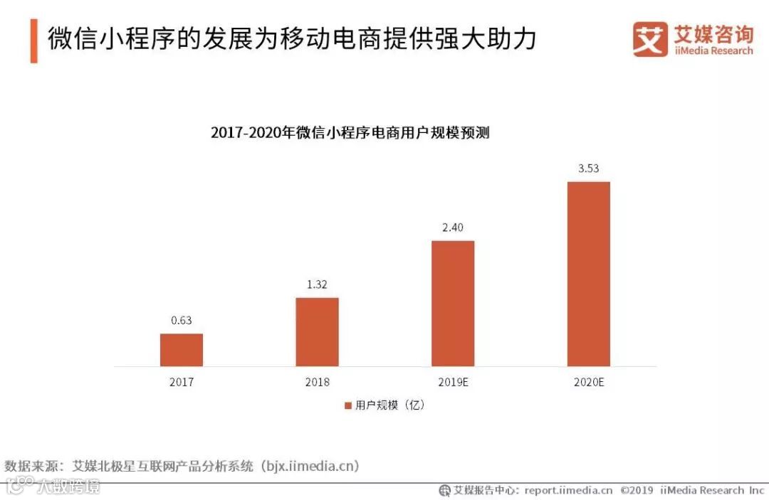 iiMedia Research(艾媒咨询)数据显示,2019年微信小程序电商用户预计将达2.40亿人。艾媒咨询分析师认为,微信平台红利及小程序的诞生,为移动电商发展提供强大助力。社交工具特别是微信已形成强大的社交用户基础,微信通过社交和公众号将人与内容形成连接,而微信小程序的推出则实现对产品的连接,移动电商借助微信小程序可以更高效地触达用户,引发其消费需求。
