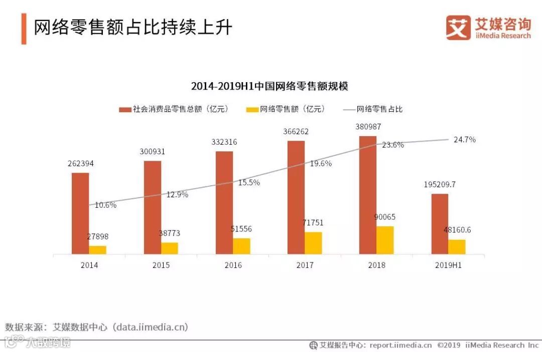 iiMedia Research(艾媒咨询)数据显示,中国网络零售额在社会消费品零售总额中所占比重逐年上升,2019年上半年,中国网络零售额达195209.7亿元,占社会消费品零售总额24.7%。艾媒咨询分析师认为,自从电商行业在中国兴起后,网购消费在人们生活中的重要性不断提高,网购已成消费者消费重要渠道。