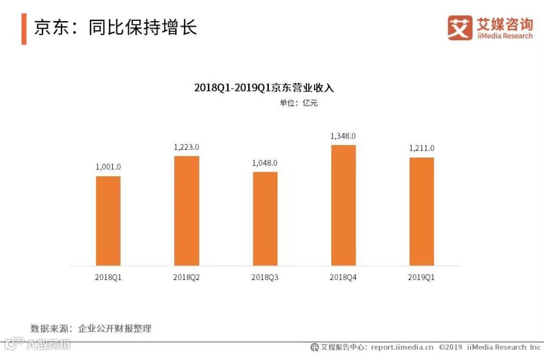 2019年第一季度,京东营业收入为1211亿元,同比增长20%。艾媒咨询分析师认为,京东在优化拣选系统,完善自建仓储和物流配送体系等方面持续发力,为进一步订单规模扩大的同时,保证平台的效率和履约能力,也由此成为了京东保持营收增长的重要动力。