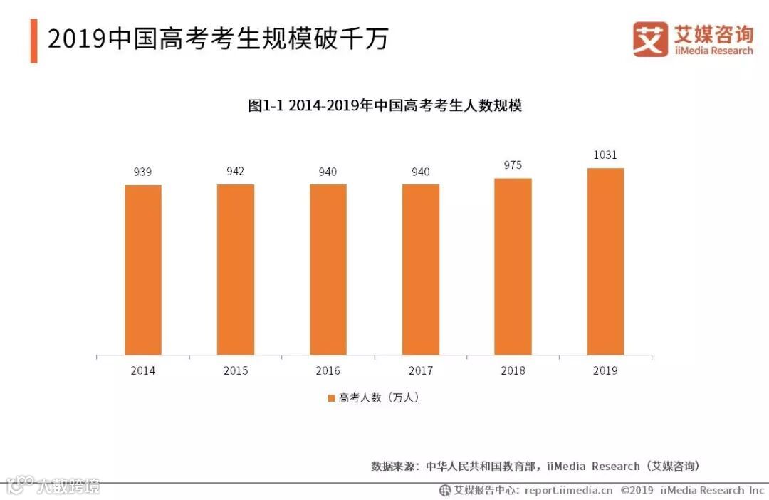 中国高考考生规模逐年增长,据教育部最新数据显示,2019年中国高考考生规模达到1031万人,较2018年增长56万人。